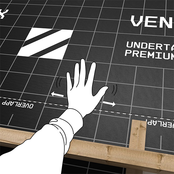 For å sikre at limskjøten blir tett uten bukler bør man bruke et bord som understøttelse under øvre limskjøt. Legg et bord f.eks. 19 x 148 mm der øvre limskjøt vil ligge og fest bordet midlertidig. Rull ut en bane med undertak og fest undertaket. Løsne bordet og fest det til sperrene der neste omlegg vil komme. Dette vil gi god framdrift og sikrer tett omlegg.