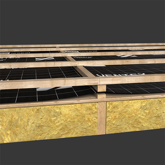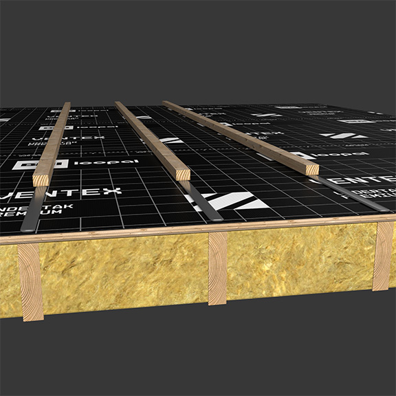 Ved bruk i takkonstruksjoner under10° fall, kan undertakene Premium og Pro brukes som vindsperre. Se Byggedetaljer 525.324 Isolert, luftet terrasse med trebjelker