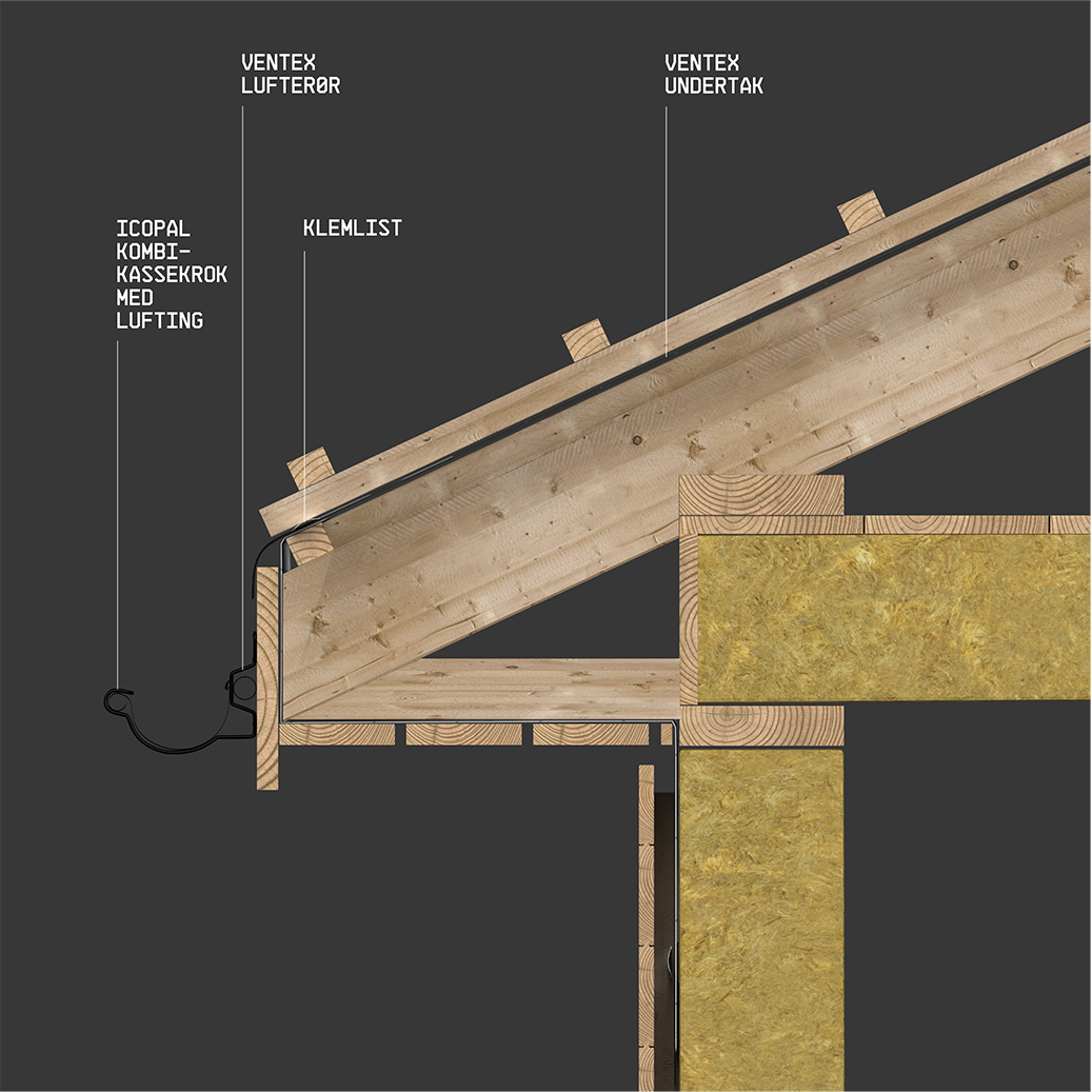 For begge løsninger skal det monteres Icopal Kombi kassekrok med lufting for å oppnå tilstrekkelig lufting mellom undertak og taktekning. Icopal Lufterør ø32 mm benyttes sammen med takrennekroken for å stenge mot fugler.